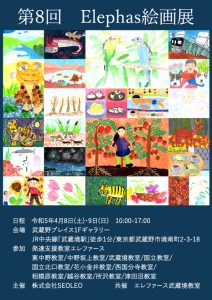 さてこの度、「第8回Elephas絵画展」を開催する運びとなりましたのでお知らせ致します。発達支援教室エレファース全11教室が参加し、東京都武蔵野市の武蔵野プレイスにて4月8日、9日の2日に亘り開催致します。出品者の日常や個性ある世界を感じていただけましたら幸いです。